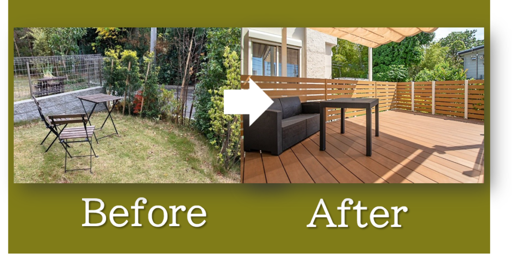 施工後:目隠しフェンスで囲ったウッドデッキを新設。リビングから続く広々とした空間で、ご家族でゆったりとお過ごしいただけます。