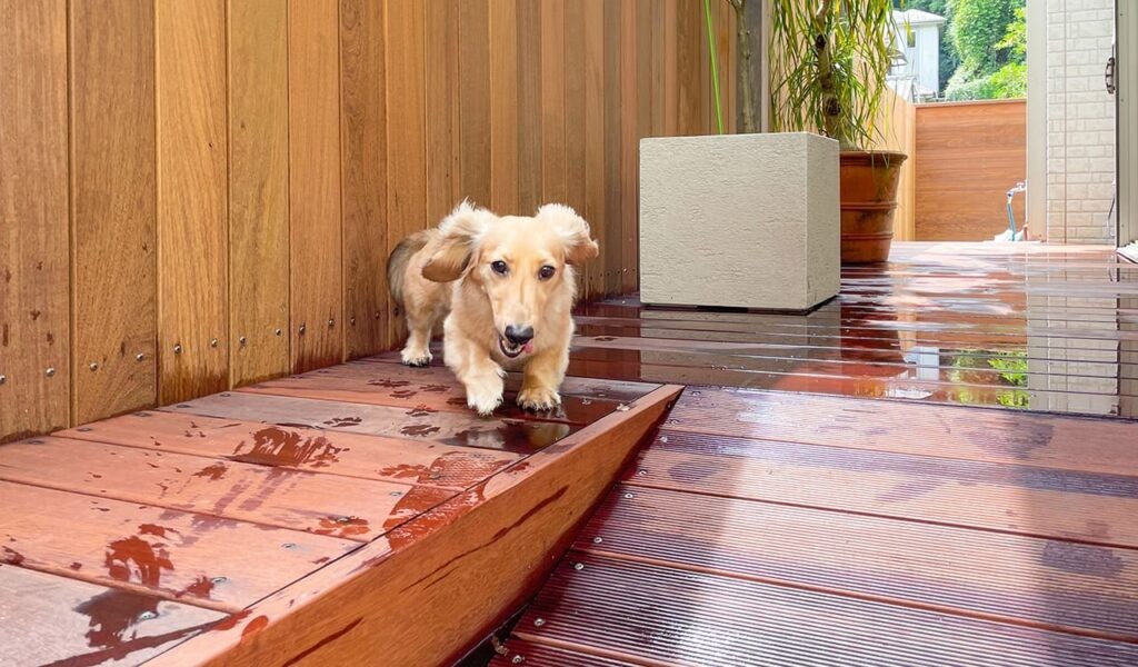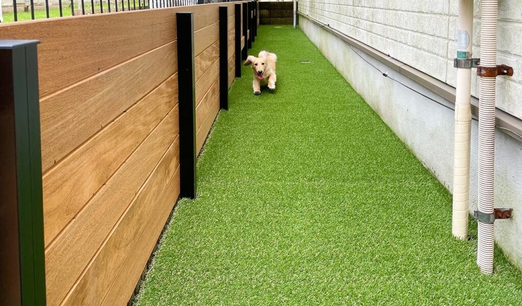 「以前は土のままで管理がしにくかったお庭に、天然木のウッドデッキと人工芝のドッグランを作ってもらいました。庭の手入れがとってもラクになりましたし、お庭に出やすくなりました。本格的に暑くなる前に完成したので、今年は雑草を取る手間がないと思うと、とても嬉しかったです。夏の間も犬の遊び場として毎日活用していました。」
