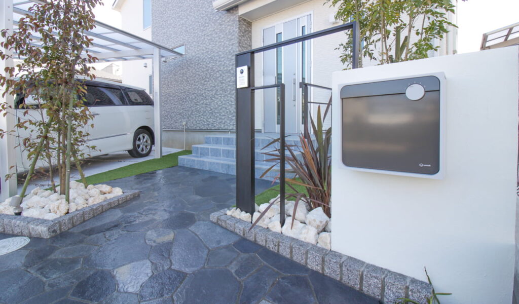 ファサードは、車2台が入る大きなカーポートのある駐車スペースと、黒い石張りのアプローチ、中央には人工芝のエリアを設け、視覚的にわかりやすく、動線を分けました。Amazonの宅配物も入る大型のポストと、シンプルフレームでモダンな門袖が目を引きます。