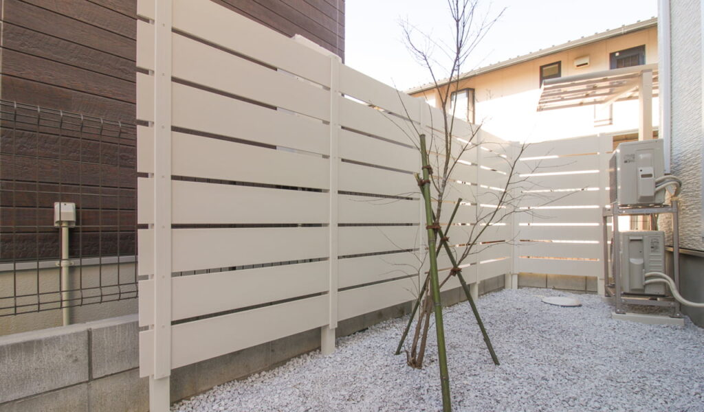目隠しフェンスは、弊社でも施工実績が多くある樹脂フェンス、白のアルファウッドフェンスを選択しました。これにより、プライベートをしっかりと保ちつつ、周囲との調和も図ることができました。