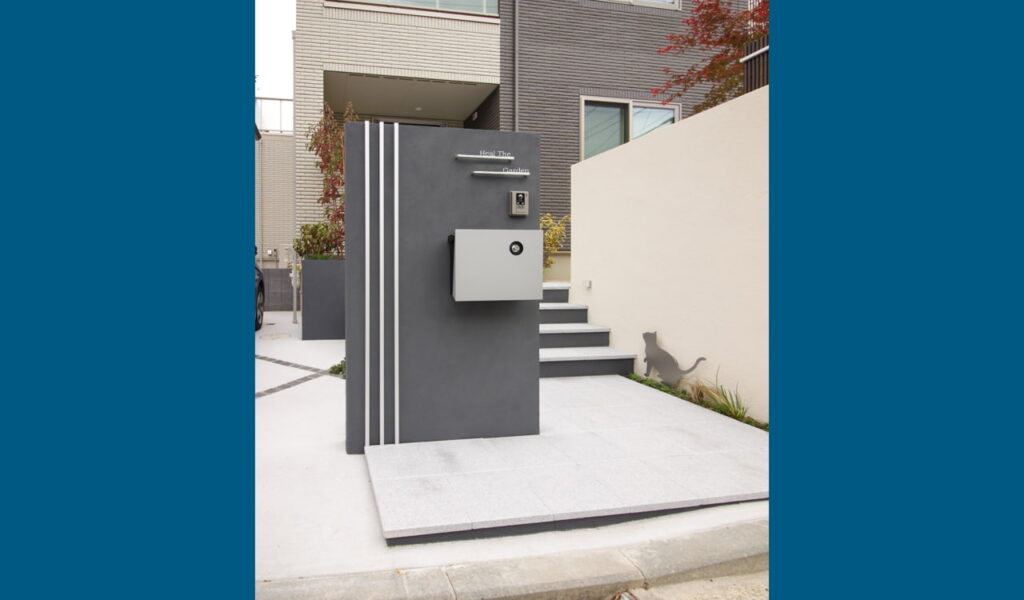 まず、シャープな外構デザインに合うよう、タカショーのアートポートを選択。そして、黒のジョリパット塗りとアルミのラインでアーバンなテイストの門袖を完成させました。玄関前には視線を引く植栽を配置。ここで、お客様が特に心を奪われたのが、ゴロタ石と白御影石の石組みと砂利敷きで彩られた和モダンな庭。