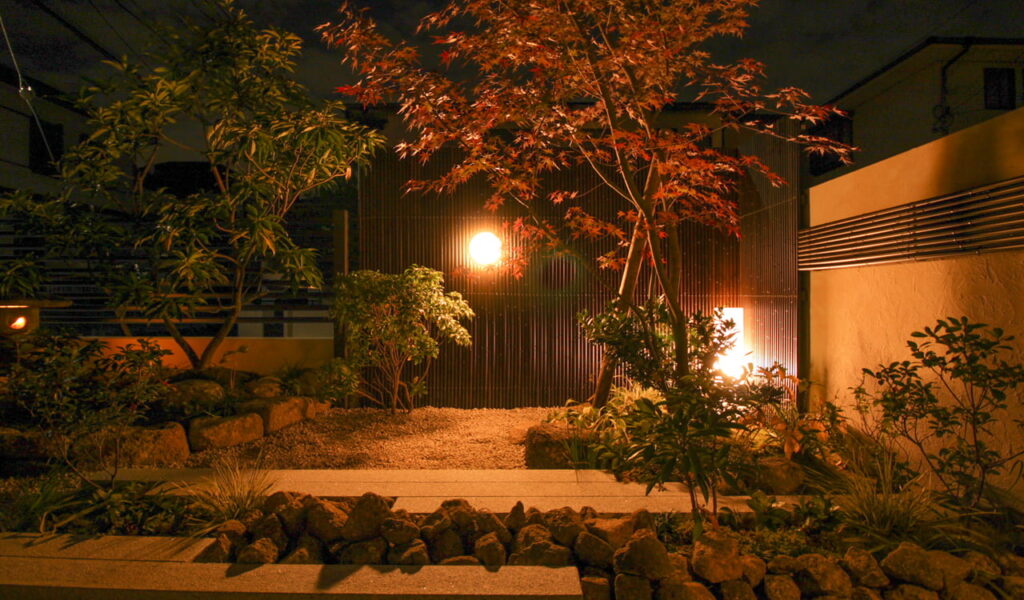 お客様がこだわった灯篭と苔は、和の雰囲気を一層引き立てます。また、夜になるとライトアップされたファサードが温かな光を放ち、まるで月のように庭を照らします。紅葉した植栽が和の趣をさらに深め、まるで一幅の絵画のような美しさを醸し出しています。