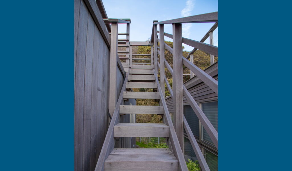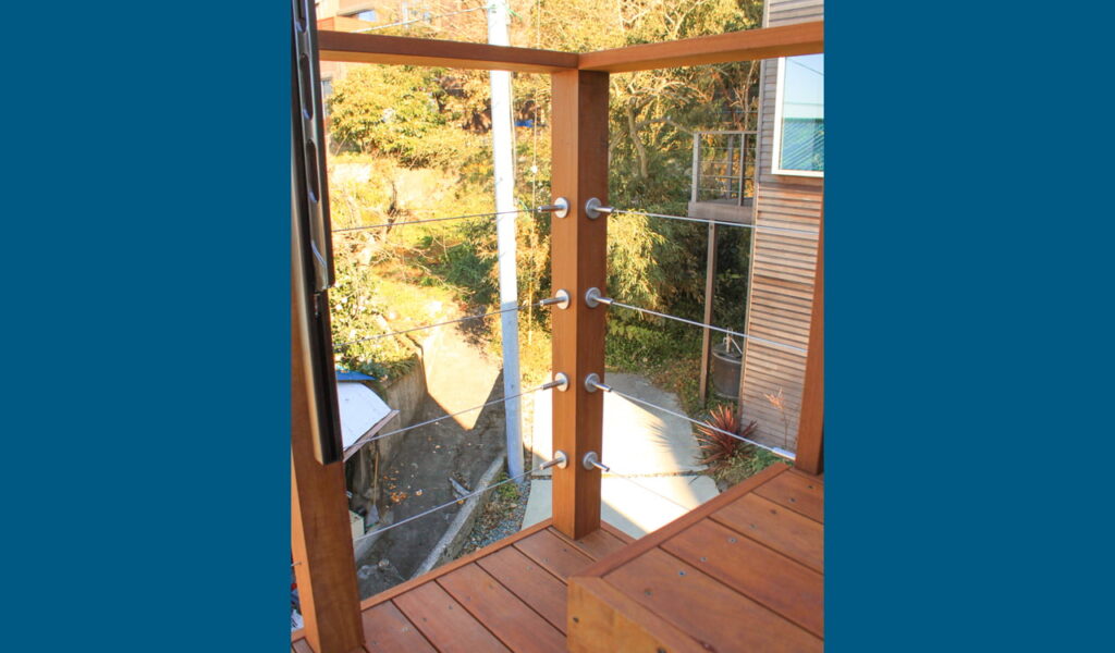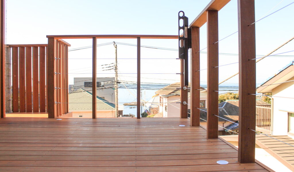 最高の眺望を遮らないよう、フェンスはワイヤー製に。これにより、邸宅の内部からも美しい海景色を堪能していただけます。また、フェンスには便利な物干し竿を掛けるパーツを設置し、機能性も兼ね備えました。デッキ床の下には波板を貼っているため、カーポートの役割も果たしています。