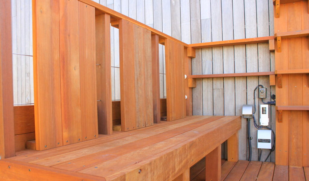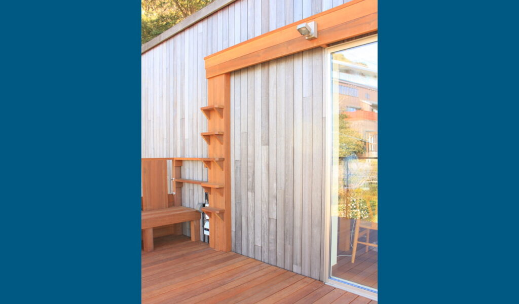 ウリン材で作った広々としたデッキには、同じくウリン材のウッドベンチを設置。くつろぎながら海を眺める、まさに至福の時間をお客様にお届けします。さらに、飾り棚とライトを設置したウッドフレームを追加。日中は太陽に、夜はライティングに照らされながら、四季折々の風景が楽しめます。