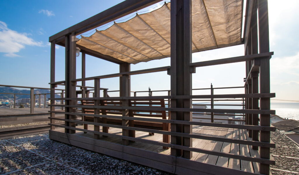 そして、ベランダから屋上に上がる階段もウリンで造作。その先の屋上にも、ウリン材の屋上デッキを施工いたしました。さらに高い位置から、目の前に葉山の海を一望できます。シェード付きのパーゴラで日差しを調整できる屋上デッキテラスは、お客様の最高のリラクゼーションスペースです。