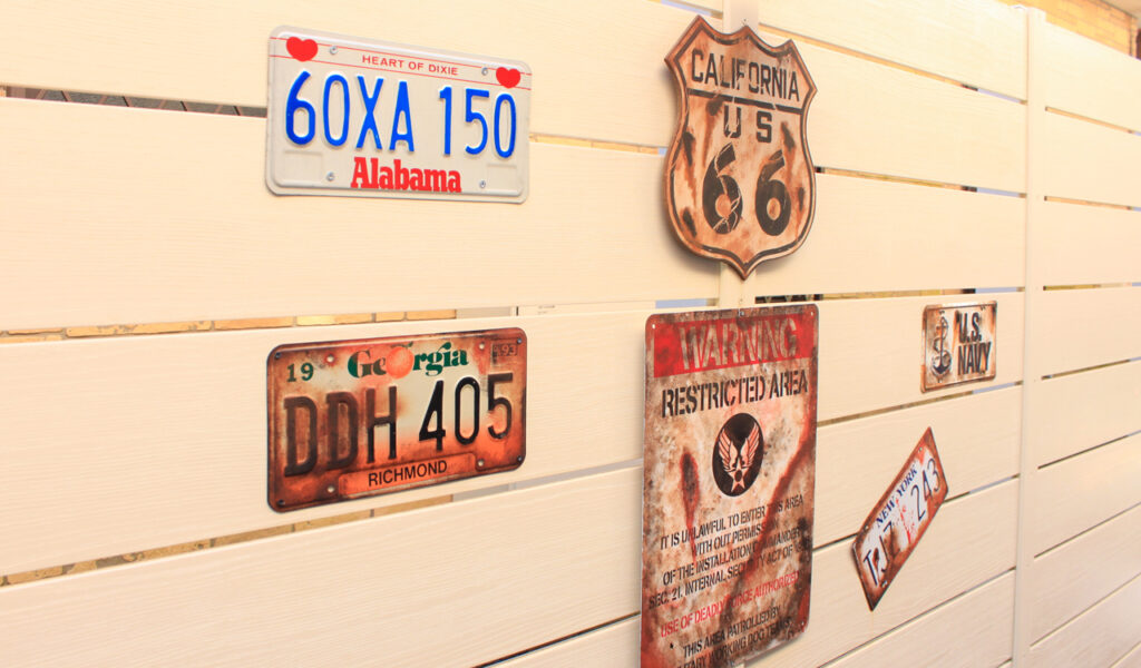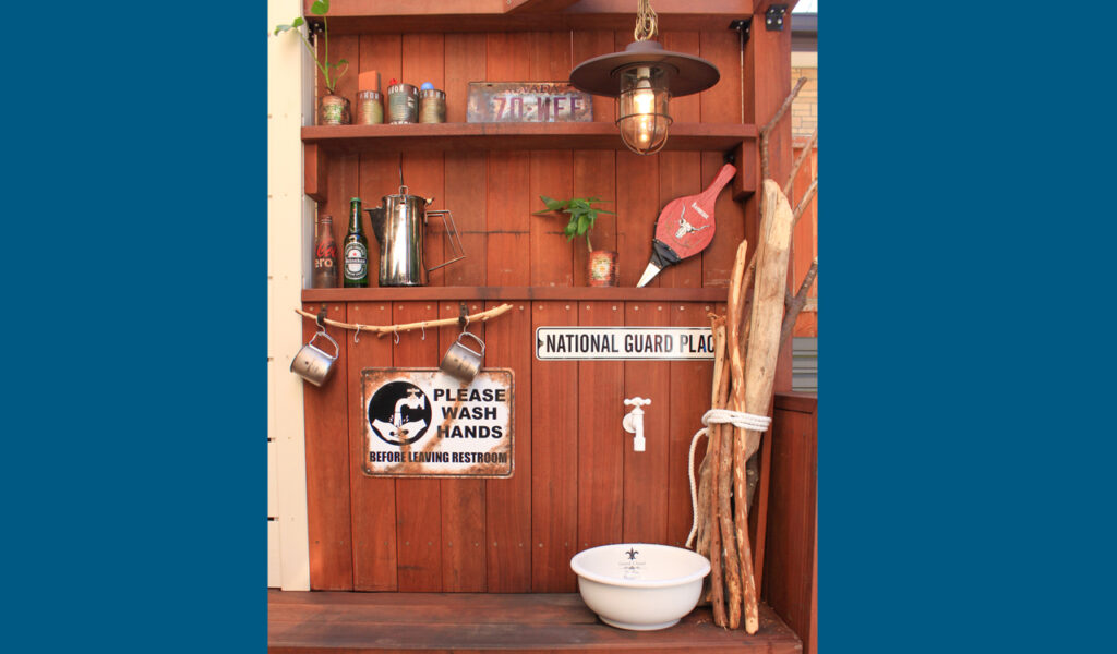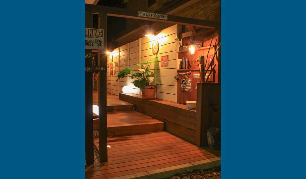 私が得意とするウッドデッキスタイルですが、初の試みも随所に取り入れ、オリジナルのプライベート感のあるデッキスペースが完成しました。お施主様のセンスがとても素敵で、ビンテージ風に錆び塗装を施したサインが雰囲気を一層高めています。