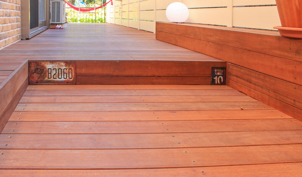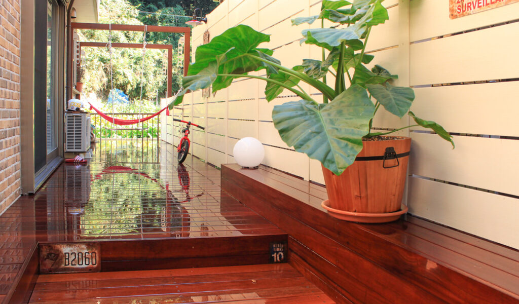 ウリン材は、硬さと耐久性に優れており、年数を重ねるごとにシルバーグレーの色合いに変化しながら、風合いが増していくという特長を持っています。このウリン材を使うことで、年数を重ねながらビンテージ風の雰囲気を更に引き立て、お客様の理想とする空間を実現できると思いご提案いたしました。