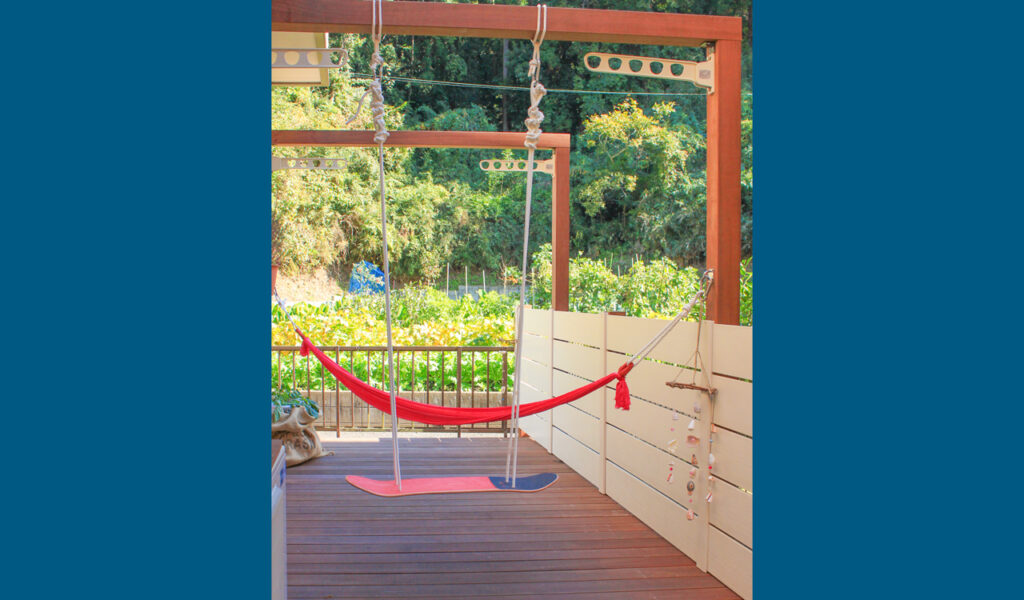 お客様のセンスが抜群で、完成後のインテリア小物の飾りつけによって、趣味であるアメリカンビンテージ風の雰囲気をまとったウッドデッキとなりました。ウッドフレームのブランコは、お子様の大好きな遊び場だそうです。