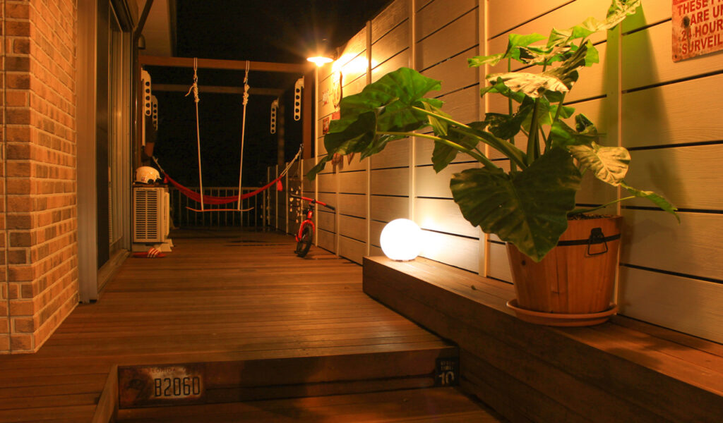 目隠しには樹脂製のアルファウッドフェンスを選択。圧迫感の出ないようホワイトを選びました。これにより、プライバシーを保ち気兼ねなく過ごせる空間になっています。お客様のライフスタイルに合わせて、手洗い用の水栓や大き目のステップ、物干し用のウッドフレームをウリンで造作して設置しました。夜にはライトアップにより、山小屋のような雰囲気を醸し出します。