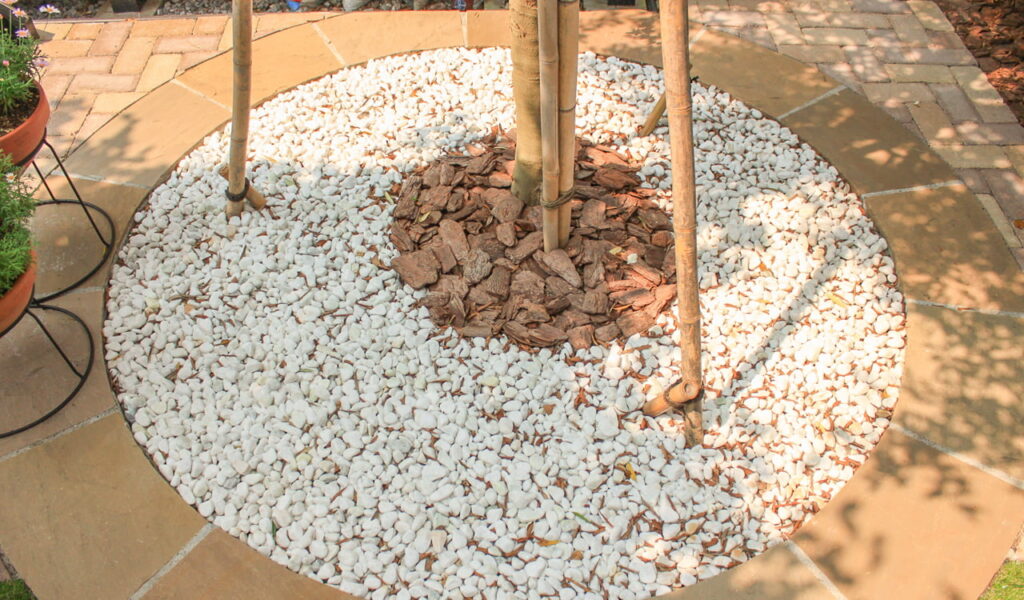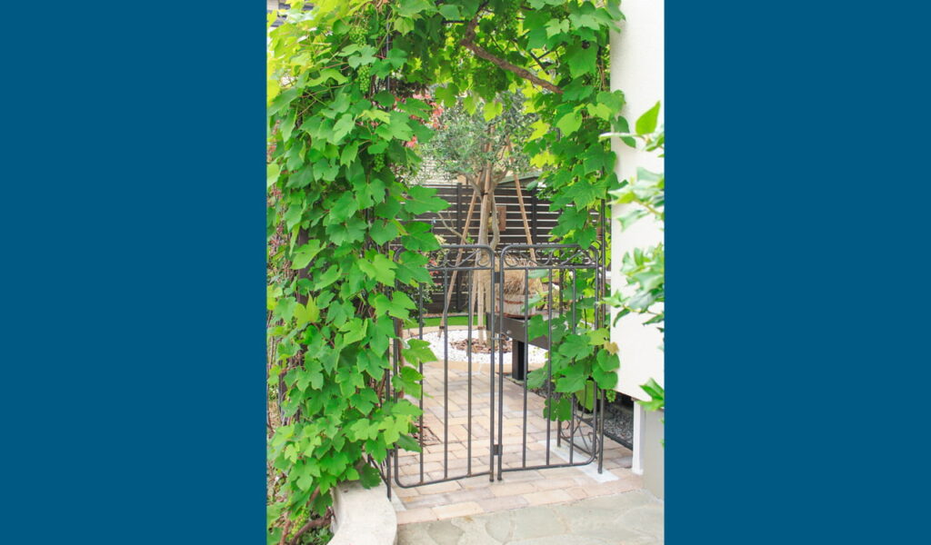 既存のオリーブの足元には、白い玉砂利を敷き詰めたサークル花壇を配置。美しい緑と白がコントラストをなし、明るい雰囲気を作り出しました。ぶどうのつるが絡まった美しいアーチ門扉は、足元をコンクリートでしっかり固定しています。これにより、お客様のガーデニングの趣味を引き立てる仕上がりになりました。
