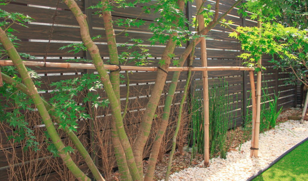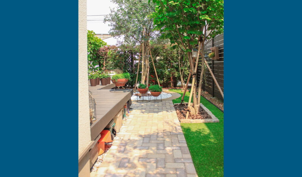 スタッフとの打ち合わせを重ね、お客様のご意向を尊重しながらも、長持ちしやすさと美観を両立した提案を行いました。既存のウッドデッキやフェンスを活かしながら、人工芝とインターロッキングを用いてグランド面を整備し、雑草の生えにくい庭を設計しました。