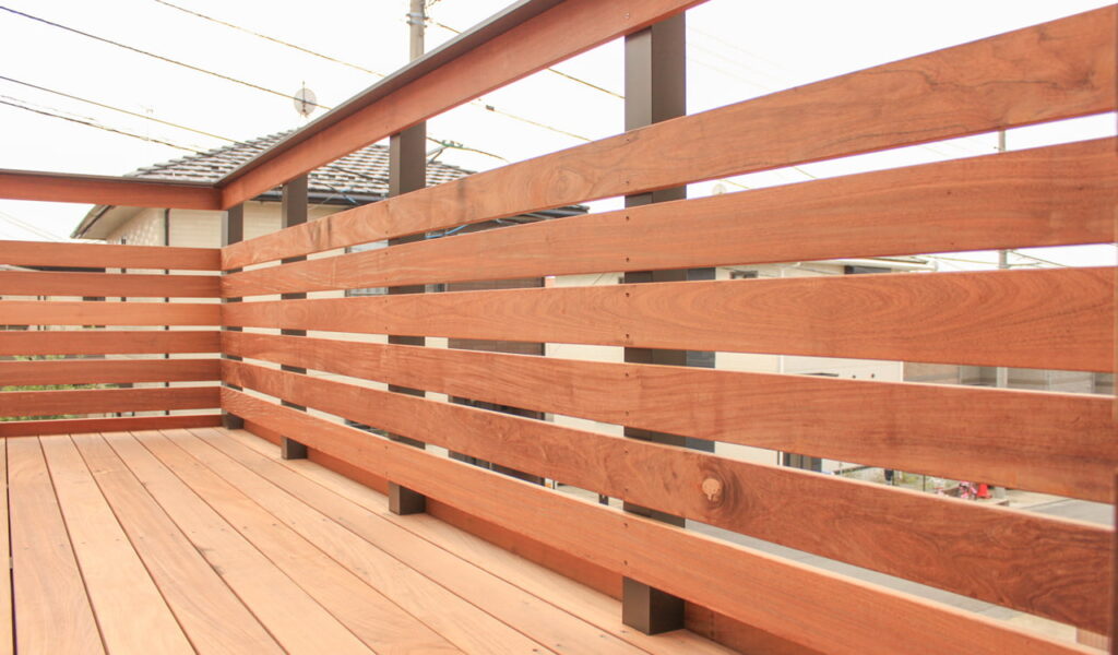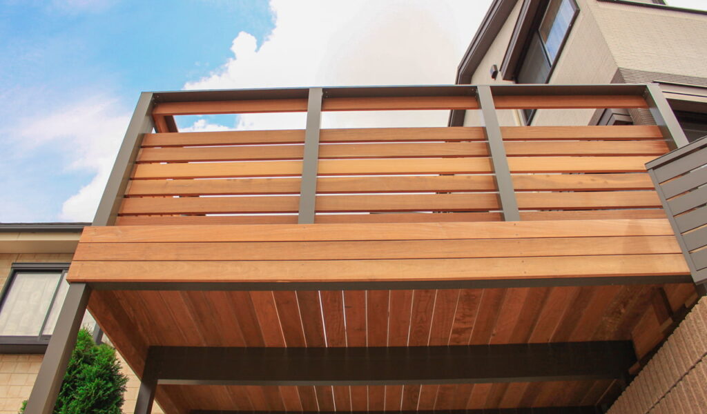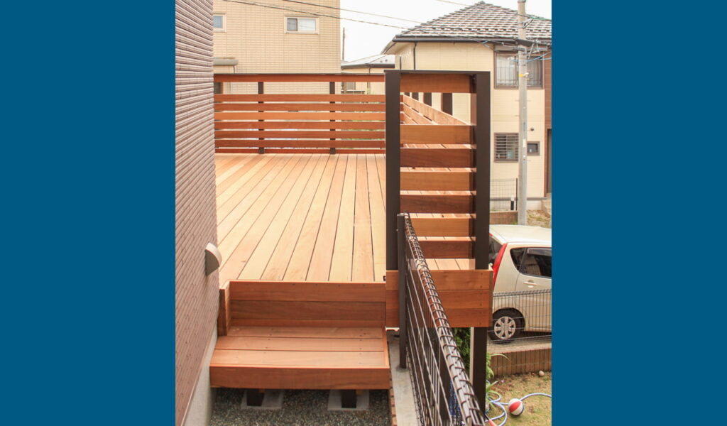 デッキの素材には、ウリンよりナチュラルな風合いで、木目の綺麗なイペ材を選定しました。お客様がリビングから見たときには、より美しい風景を楽しんでいただけます。また、デッキの下が駐車スペースの為、アクがでないという点も考慮して選んでいます。下の歩行者から見えないように、同じくイペ材のフェンスを設置しています。板の間は間隔をあけ、ハンギングも楽しめるようにデザインしました。