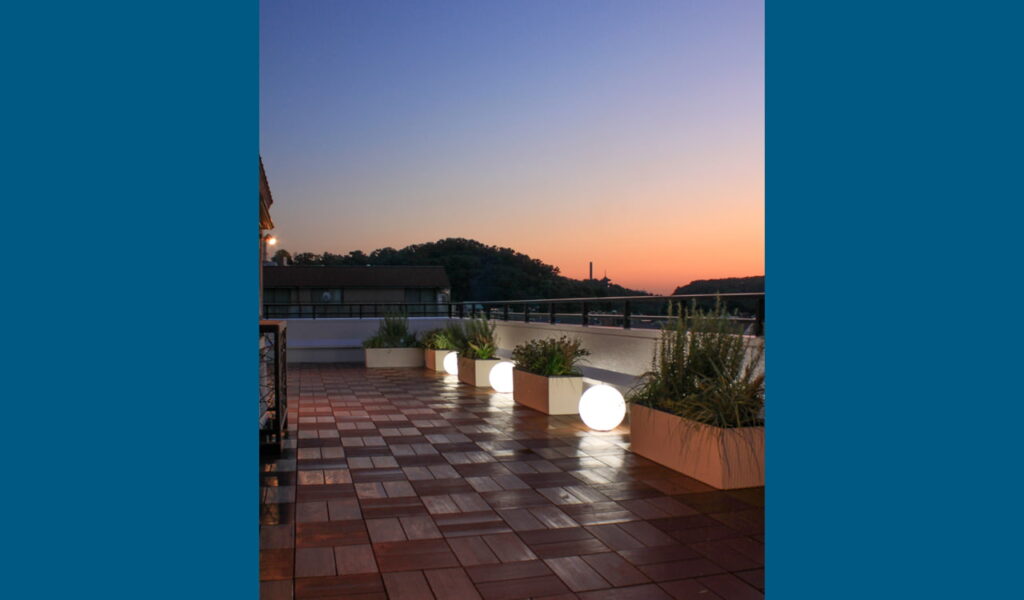 施工が完了し、お客様のバルコニーはかつての老朽化した姿から一新。都会的でシンプルなデザインと、ガーデンライトによる幻想的な雰囲気が同居する空間が誕生しました。