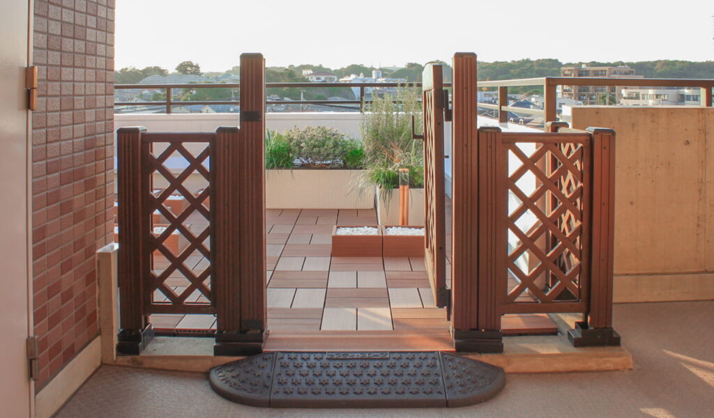 施工に取り掛かり、まずは既存のウッドデッキパネルを全て取り払い、新しいパネルを貼り付けることから始めました。エントランスにはウッド調のゲートを配置。シンプルながらも高級感あふれる空間が生まれました。