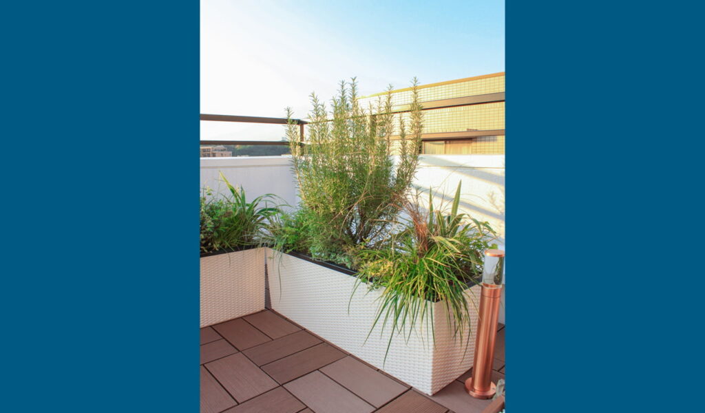 さらに、お客様が植物を楽しむための白いプランターを配置。このプランターは二層になっていることで水を貯めることのできる仕組みがあり、お客様が忙しい日でも植物を手軽に育てることができます。