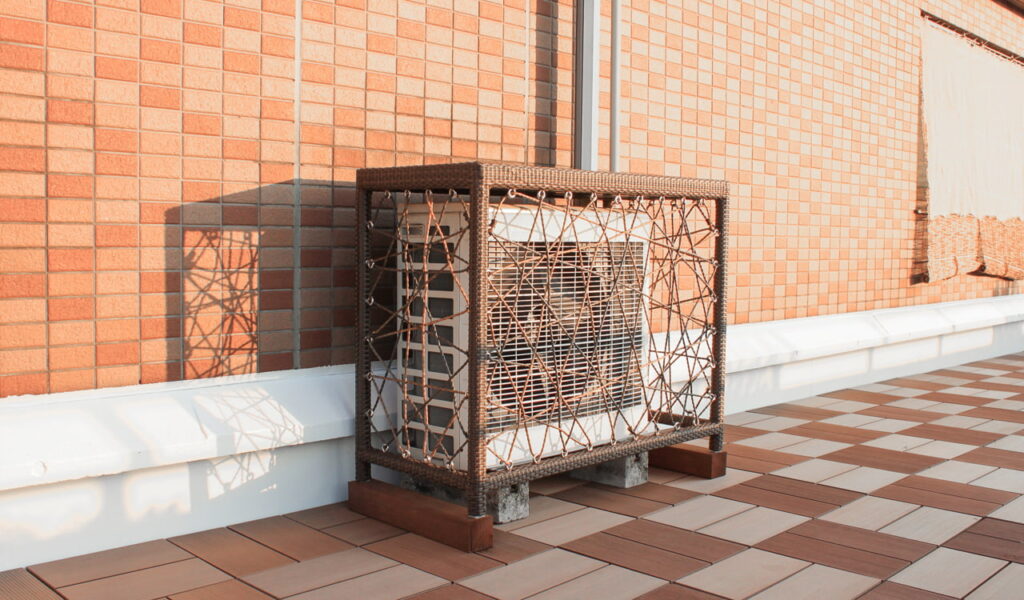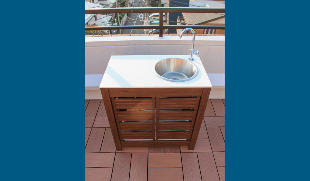 次に、お客様が一番希望されていたガーデンライトを配置しました。深夜のバルコニーを照らすこのライトは、まるで惑星のようにバルコニーを幻想的に彩ります。そして、機能性も忘れずに、立水栓を使い勝手の良いガーデンシンクにリフォームし、室外機はラタンとワイヤーのモダンなカバーで目隠しました。