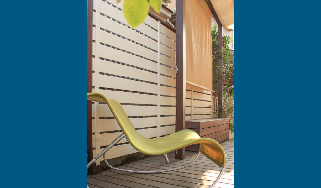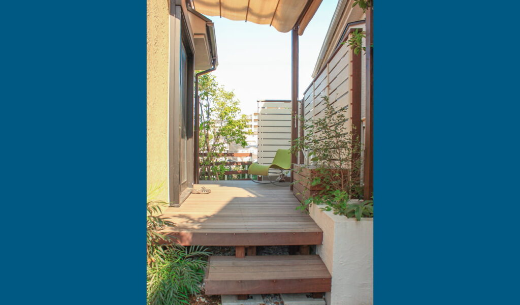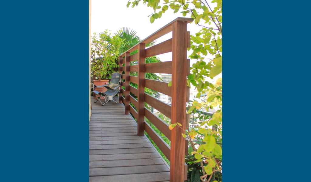 デッキの目隠しが必要な面には、高さのある白いボーダーの木目調フェンスを設置しました。このフェンスにより、プライベート間満載の空間になりました。眺望の良い方面には、落下防止のためのウリンフェンスを設置し、景観を望めるように隙間を大きくとりました。これにより、お客様は安心して景色を楽しみながらデッキでの時間を過ごすことができ、我々もまたお客様の笑顔を見ることができました。