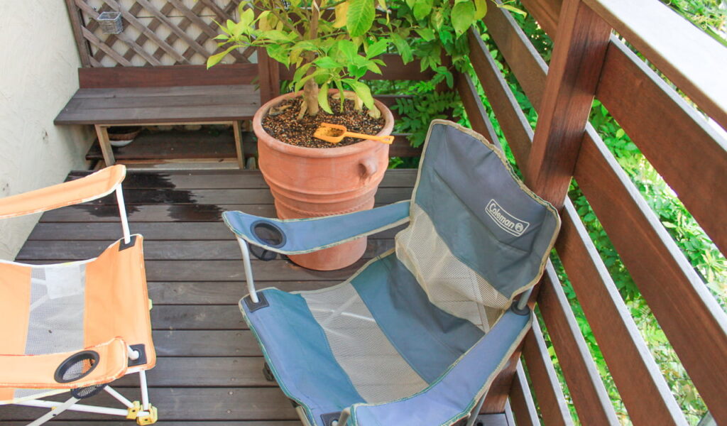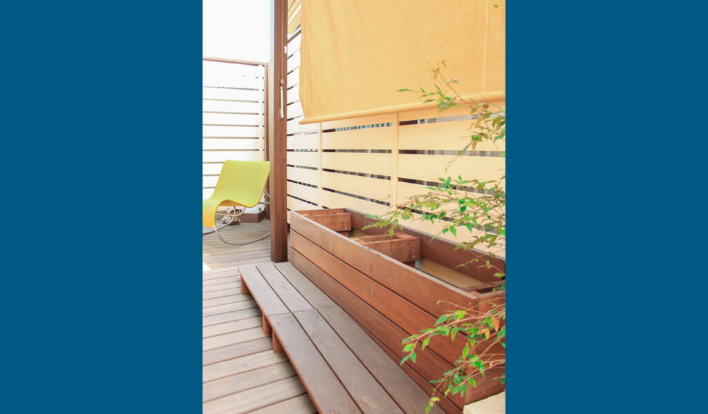 施工は、ウリンのウッドデッキと白の木目調フェンスの組み合わせ。ウリンは、その耐久性と美しさからデッキ材として人気のある材料です。同じウリンで造られたベンチは、天板がはずせるストッカーにもなっています。
