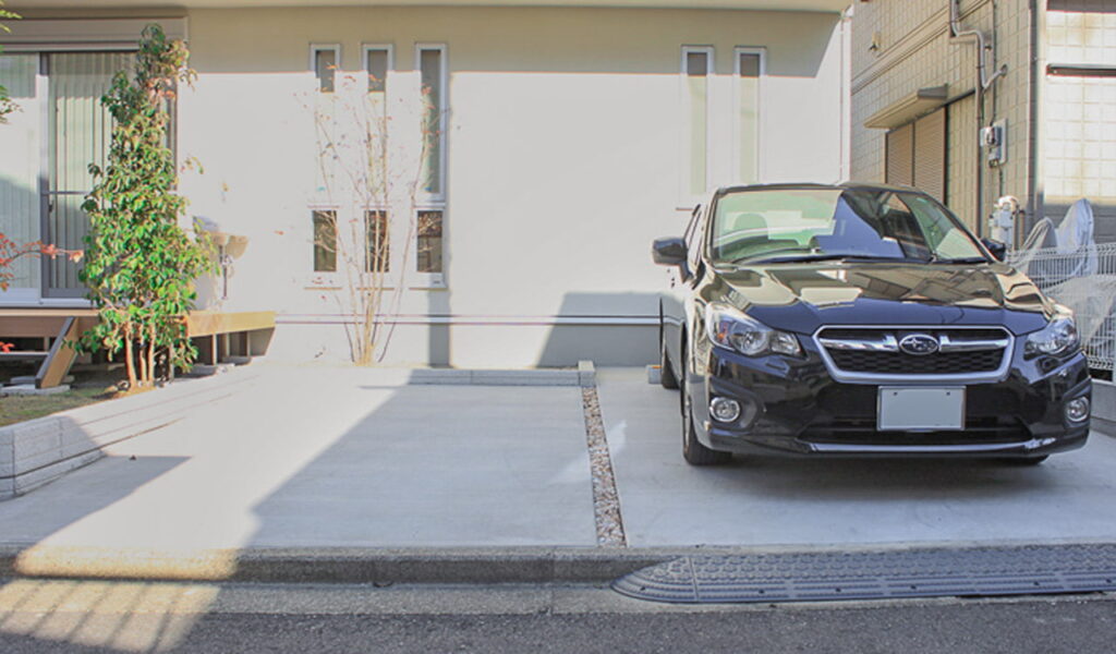 駐車スペースは2台分あり、スリッドを入れて停める位置が分かりやすいようになっています。アプローチ横には、お客様のこだわりで選ばれたシンボルツリーのハナミズキ。落葉樹のため、季節にの移り変わりを感じることのできる木です。