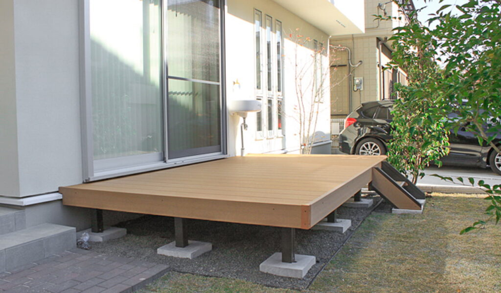 新築の外構プランと工事をお願いしたい。ウッドデッキを設置してリビングから庭への段差を解消したい。