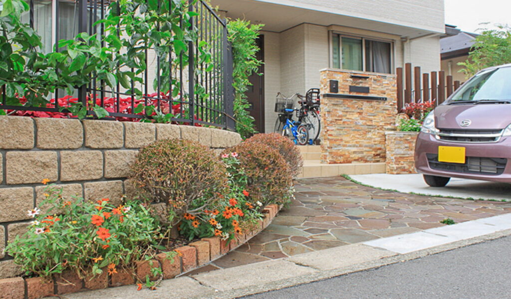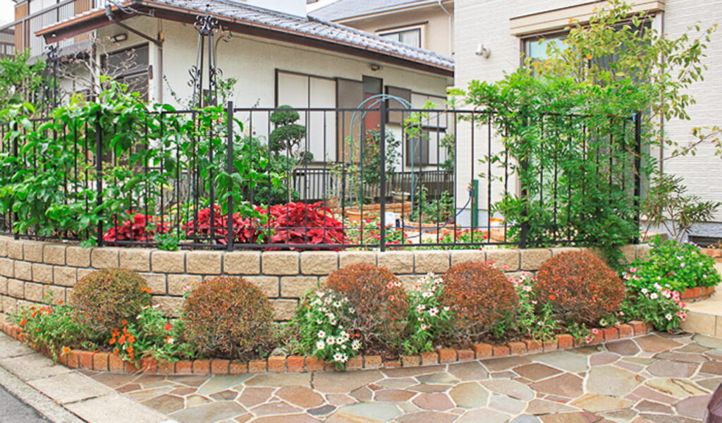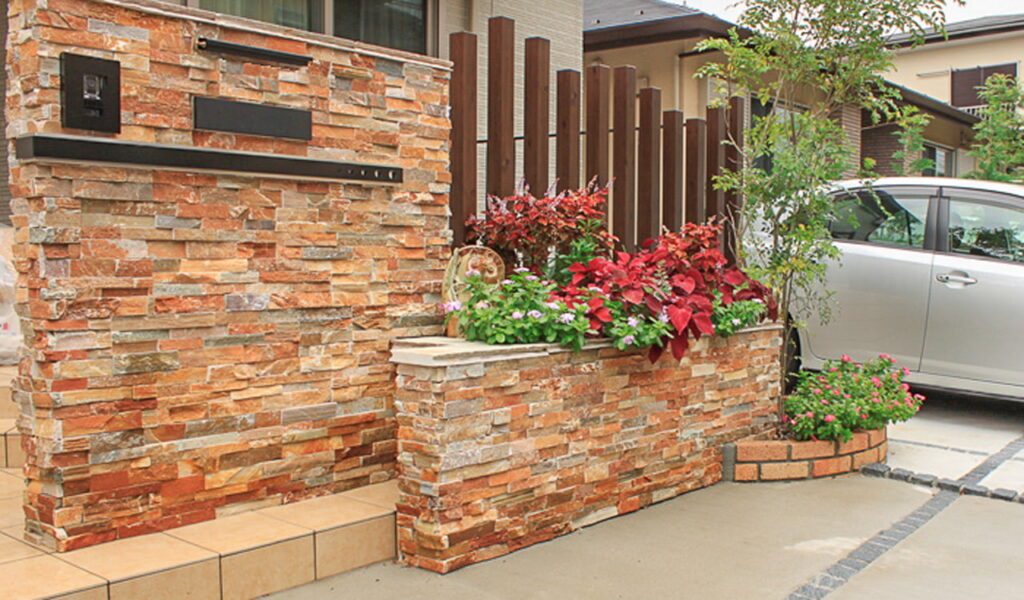 ファサードは、多くの種類の素材を茶系に統一し、違和感なくナチュラルな雰囲気を演出しております。天然石貼りの門袖は、存在感がありファサードの中心的存在。鉄平石の石貼りで作られたアプローチ、ロートアイアン調のアルミフェンス、そしてレンガ調の化粧ブロック。これらは、お客様のお庭が一年を通して美しさを保つための重要な要素となります。