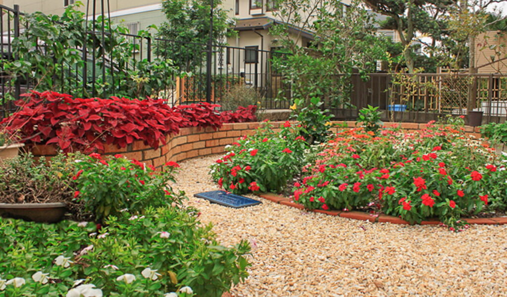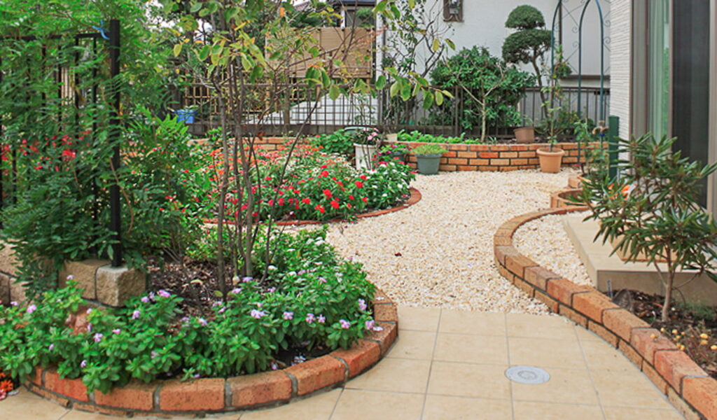 きれいな曲線を描くデザインのお庭は、お客様が植えられた色とりどりの草花であふれています。レンガ積みの高さを変えている花壇は、分かりやすく植える植物をエリア分けしています。つる薔薇を誘引するアーチは、お客様のガーデニングライフを更に楽しく豊かにします。そしてダークトーンで落ち着いた色の人工樹脂のウッドデッキは、お客様がゆっくりと自然を楽しむ場として最適です。