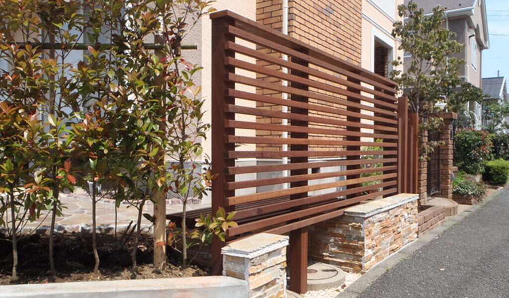 施工後のお庭は、生垣からボーダーのウッドフェンスに変わり、採光が良くなりました。目隠しよりも開放感を優先したフェンスは隙間を大きくとり、日光をたっぷりと浴びることができます。さらに、石貼りの中にはミッキーマウスが隠れていて、遊び心も忘れていません。