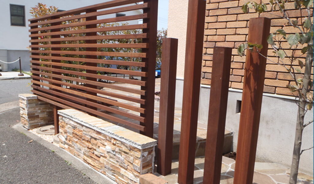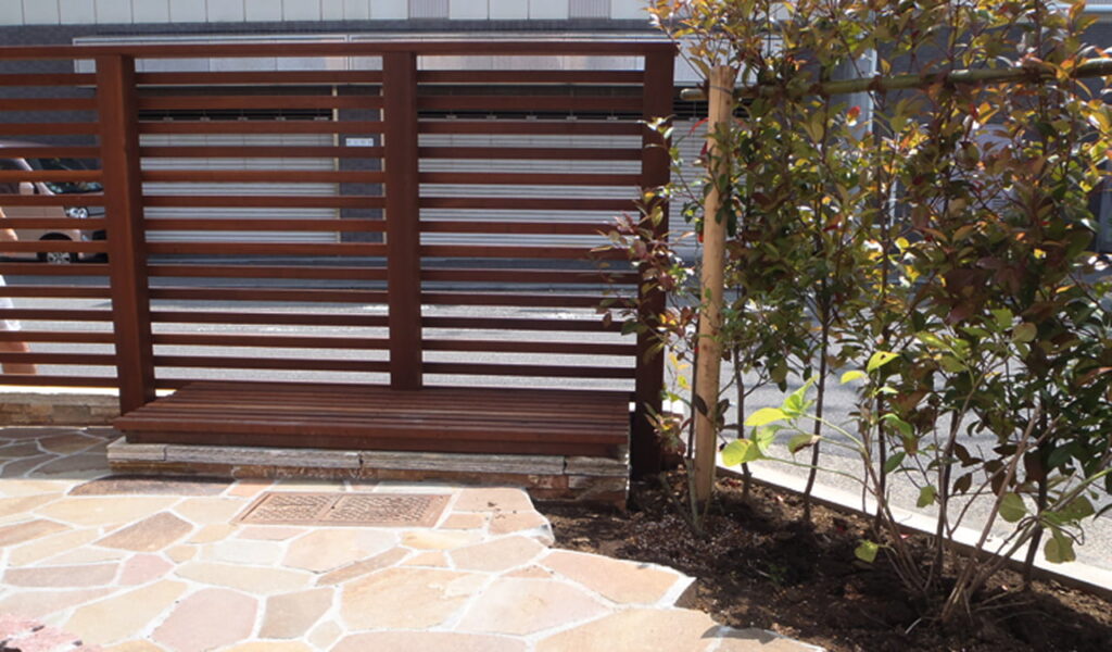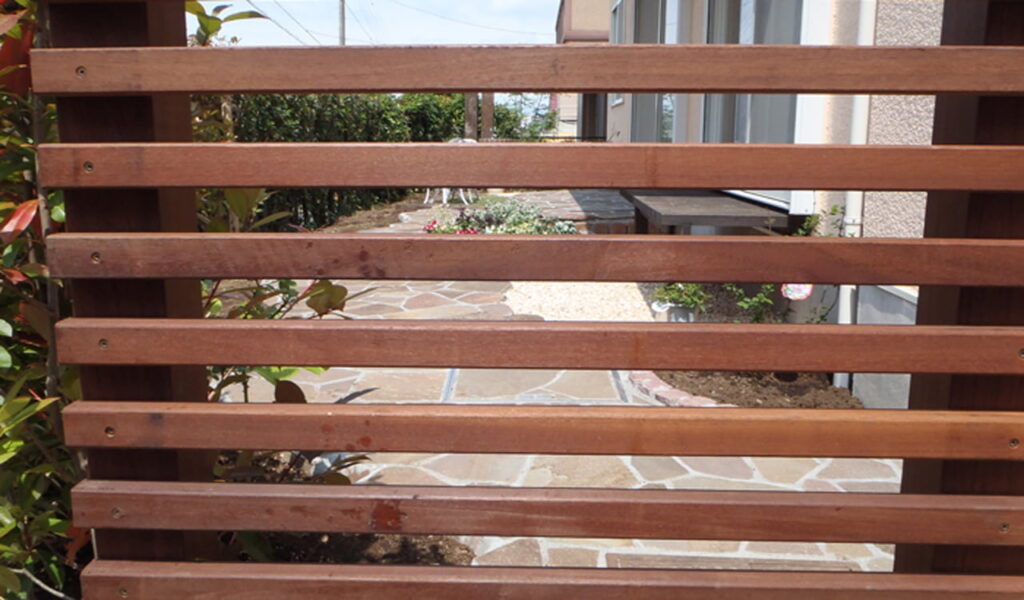 こうしたお客様のご要望を叶えるべく、我々は和風のお庭にも洋風のお庭にも合う鉄平石を乱貼りにしたテラスとアプローチを施行しました。レンガの花壇やウリンを使用したボーダーのウッドフェンスでナチュラルなお庭に仕立てました。