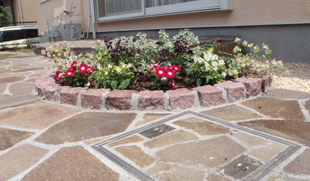 ジャワ鉄平と枕木、化粧砂利でグランド面を装飾したお庭です。円形の花壇と植栽スペースを少し残して、管理のしやすいお庭へリフォームしました。ピンコロレンガの円形花壇は、下草を植えるのにちょうど良いサイズです。メンテナンスもしやすく、四季折々の植物を楽しむことができます。
