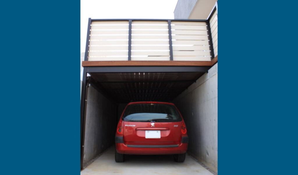 ウッドデッキの下には、雨よけ用にポリカの波板を設置。これにより、大切なお車を守ってくれます。デッキから見える横浜の風景は、日常の喧騒から解放される特別な時間を提供してくれます。