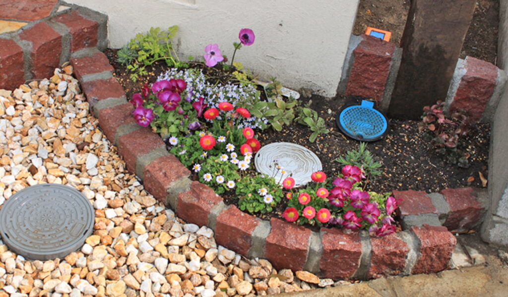 そして、特別リクエストの「ミッキーマウス風の模様」。これは、ピンコロレンガの花壇近くに隠れています。まるでディズニーランドの中にいるかのような、楽しい気分を味わっていただけるよう、隠れミッキーを仕掛けました。