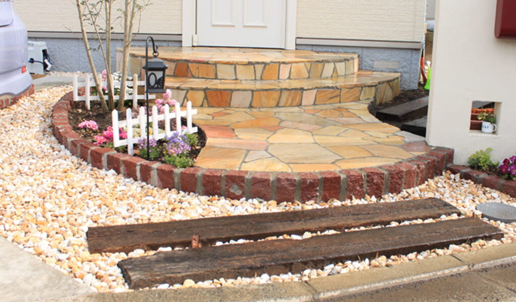 まず、白を基調とした新築の外壁に合わせ、自然石の乱貼りとレンガのファサードを採用。化粧砂利や枕木、そして白いジョリパットの門袖に映えるボルドー色のポストなど、赤や茶系の色で統一感を出すことで、全体の調和を保ちつつ、ナチュラルで可愛らしい雰囲気を演出しました。