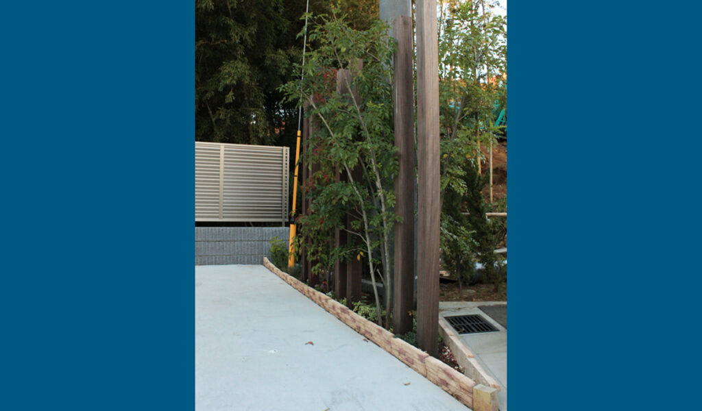 施工後のポイントは「ウリンの列柱と植栽の組み合わせで作る目隠し」。このウリンという樹種は高い耐久性を持ち、他の樹種に比べて変色や腐食が少ないことで知られています。その特性を活かし、列柱として使用することで、耐久性と美しさを兼ね備えた目隠しを実現することができました。