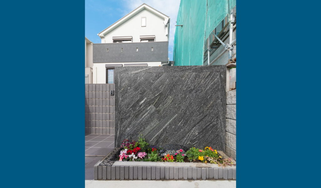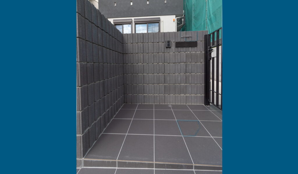 黒を基調とした素材を選び、タイル貼りのエントランスポーチを造り、化粧ブロックで駐車場とのエリア分けを行いました。特に目を引くのは、自然石風のタイルで仕上げた装飾壁です。これは、施工時にお客様と何度も打ち合わせを重ね、お客様のこだわりと私たちの技術が結実した結果です。さらに、手前には植栽を植えられる花壇スペースを設けました。これにより、お客様のお家が一段と引き立つことでしょう。