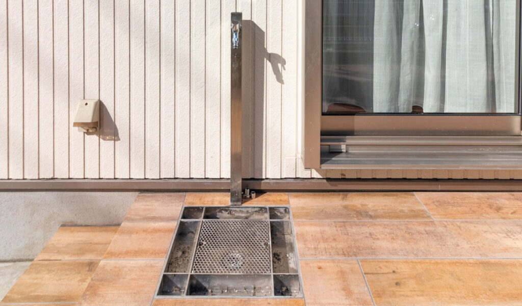 また、お隣との境界には真っ白な目隠しフェンスを設置。よりプライベート感のあるお庭になりました。フェンスへのハンギングや三角形の花壇で、ガーデンニングを楽しむこともできます。また、ステンレス色のモダンな立水栓も設置し、機能性とデザイン性を兼ね備えた庭が完成しました。