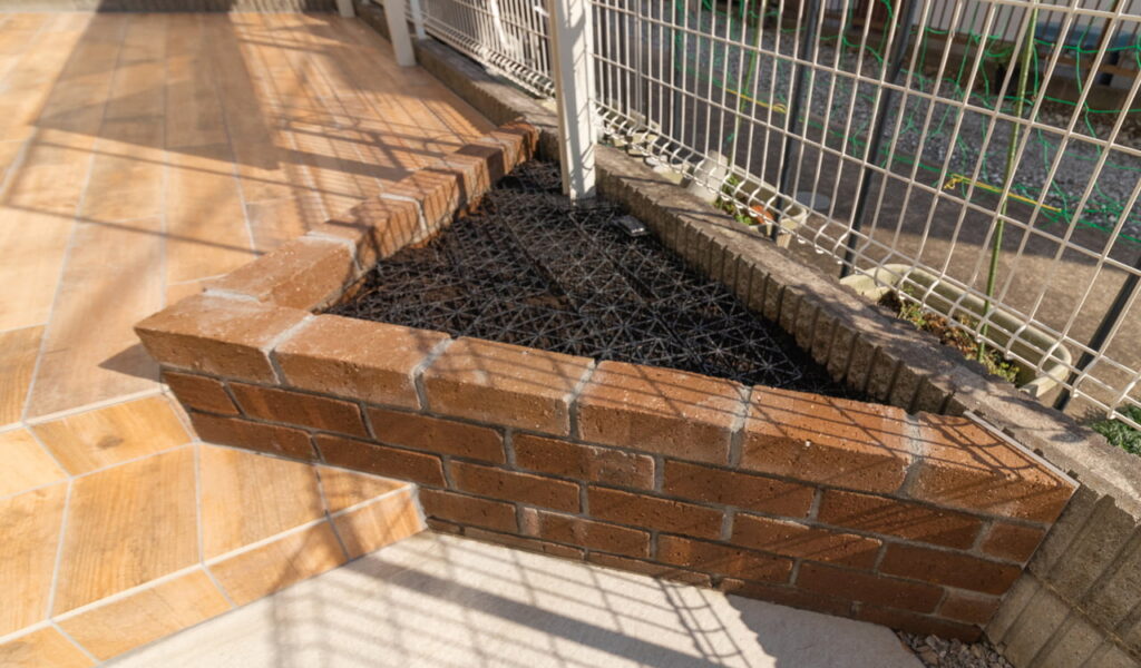 レンガ花壇と木目調タイル貼りのテラス