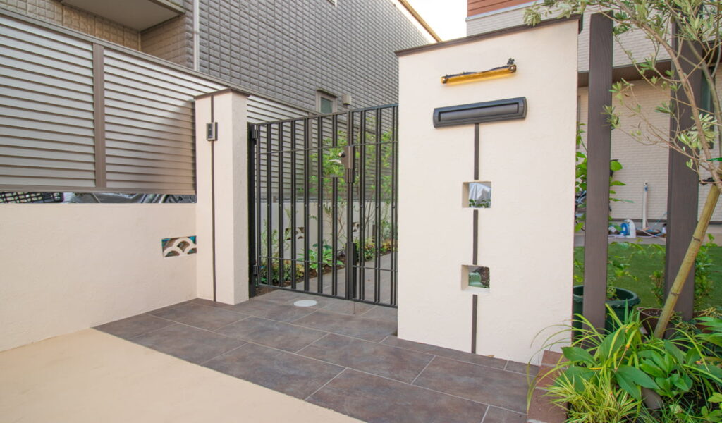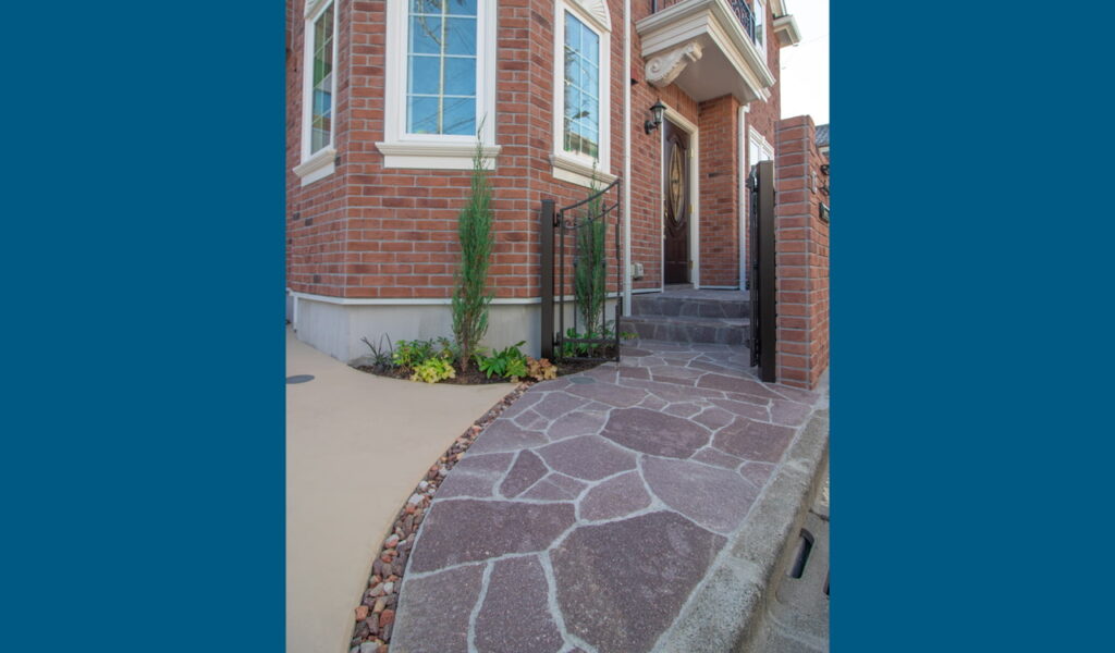 一方、モダンな邸宅の門回りは、シャープで無駄の無い印象のデザインをご提案。門塀に入れた縦のラインと、正方形のスリットがアクセントです。門から続くアプローチは、レンガの邸宅の鉄平石に似た、高級感のある濃いカラーのタイル貼りにすることで、全体の統一感を出しています。