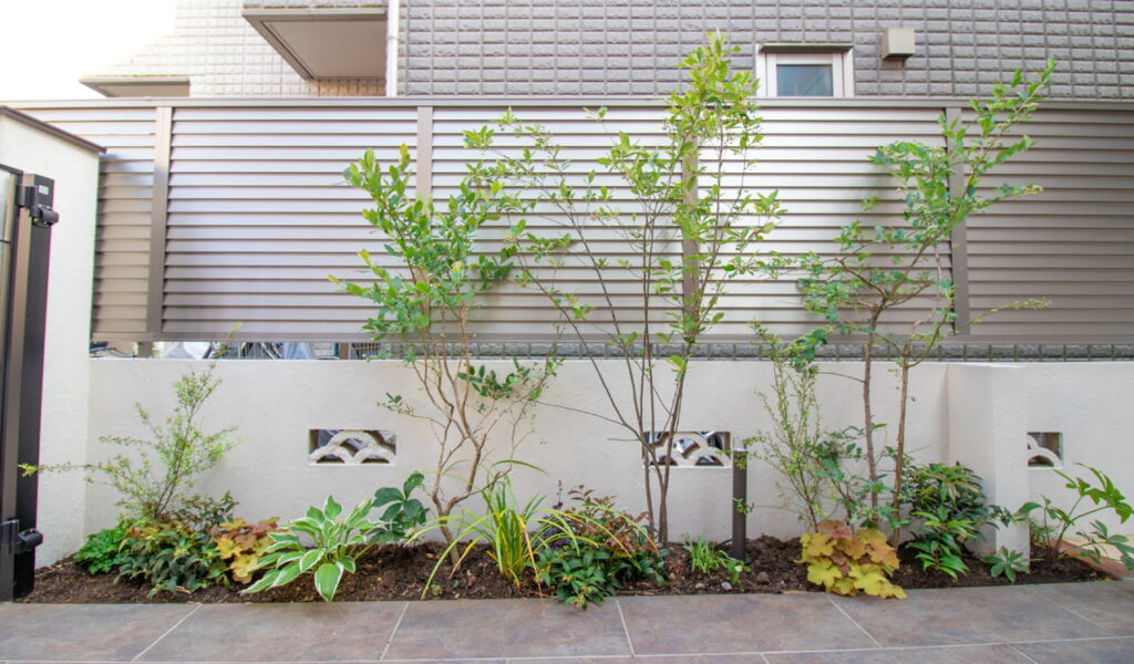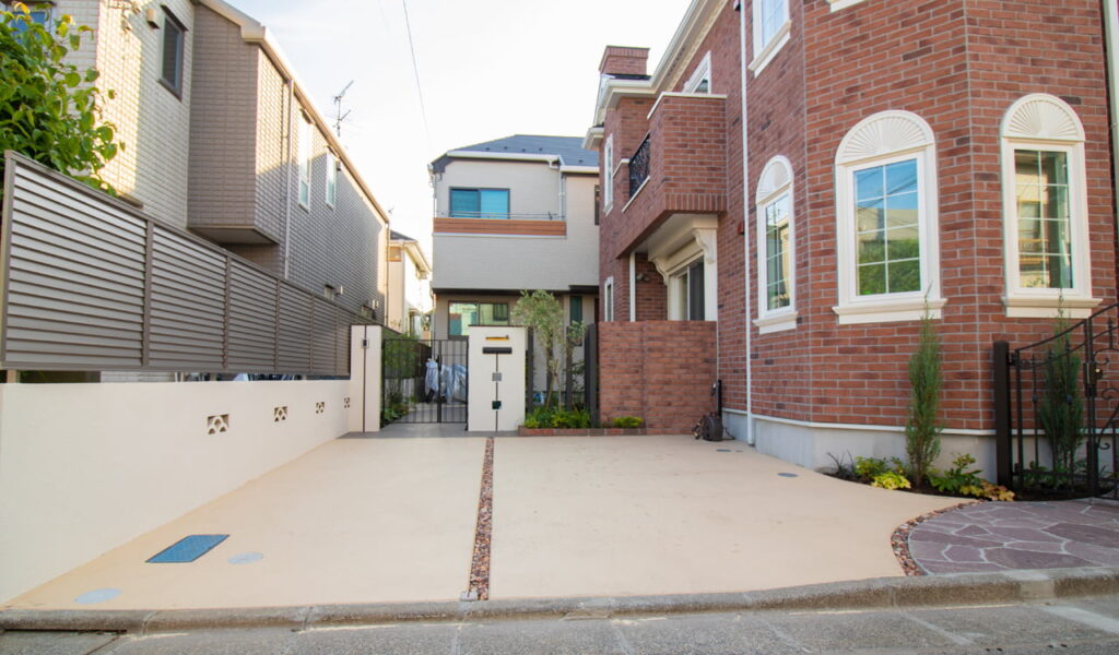 東京都大田区の閑静な住宅街。この地域で、同じ敷地内にそれぞれのお住まいをご新築された、二世帯のお客様がいらっしゃいました。お客様からは、「輸入住宅とハウスメーカーで二棟のテイストが違うけれども、それに合う共有の外構を提案してほしい」というご相談をいただきました。