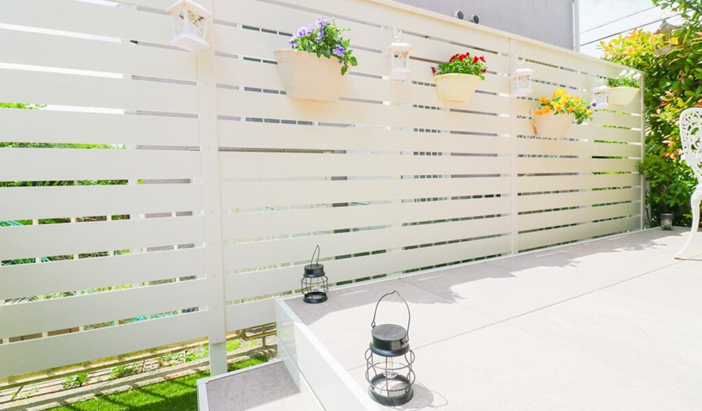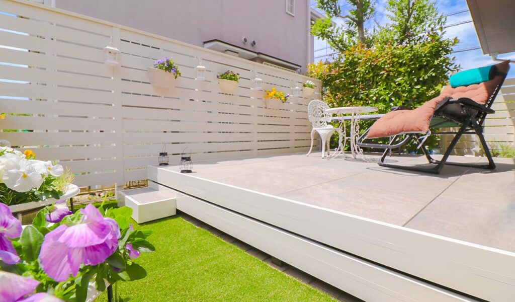 元々土だった部分は人工芝にリフォームし、お手入れの手間もなくなりお客様が心地よく過ごすことができる空間を造りました。既存のラティスフェンスは撤去し、真っ白な人工木フェンス、ベータウッドフェンスを新設。これにより、リビングの掃き出し窓から見える景色が明るく一新されました。