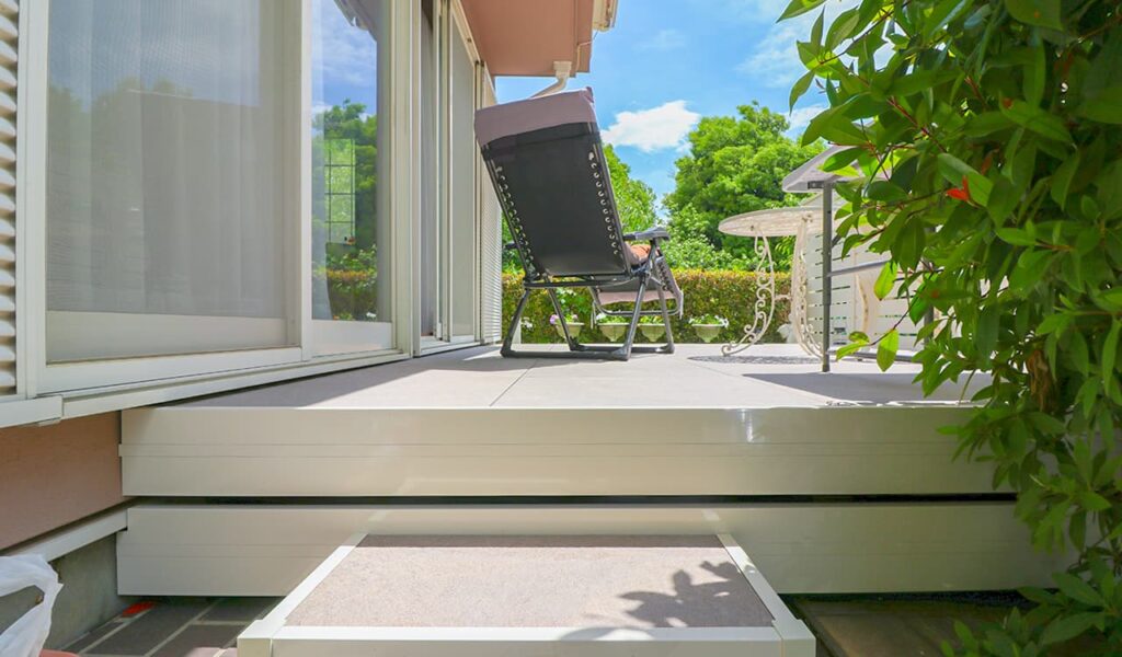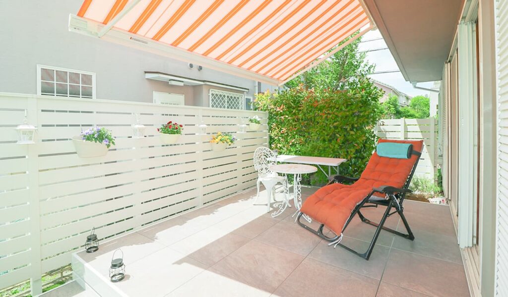 ガーデンルームのご希望に対して、立地条件、周辺の環境などを考慮した上で我々が提案したのは、独立オーニングとタイルデッキの空間です。LIXILのタイルデッキを提案し、既存のタイルデッキを解体することなく新しいタイルデッキを設置。これにより、お客様は段差を感じることなくリビングから出入りすることが可能となりました。白を基調にコーディネートしたオレンジストライプのオーニングが、建物との調和を図りながらも洗練されたアクセントとなっています。