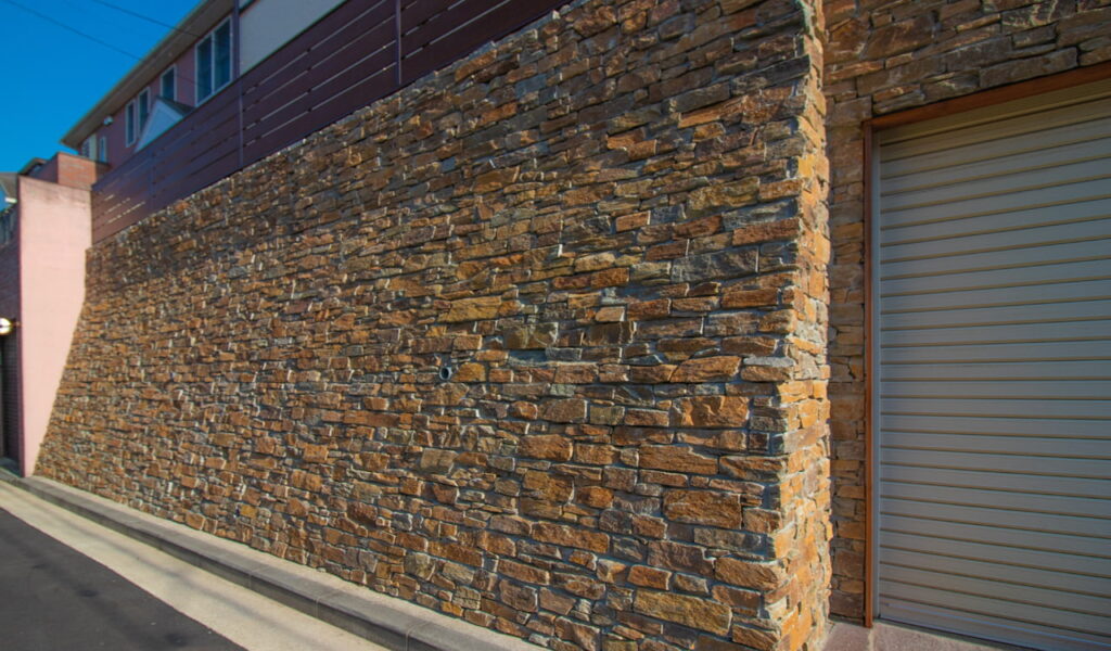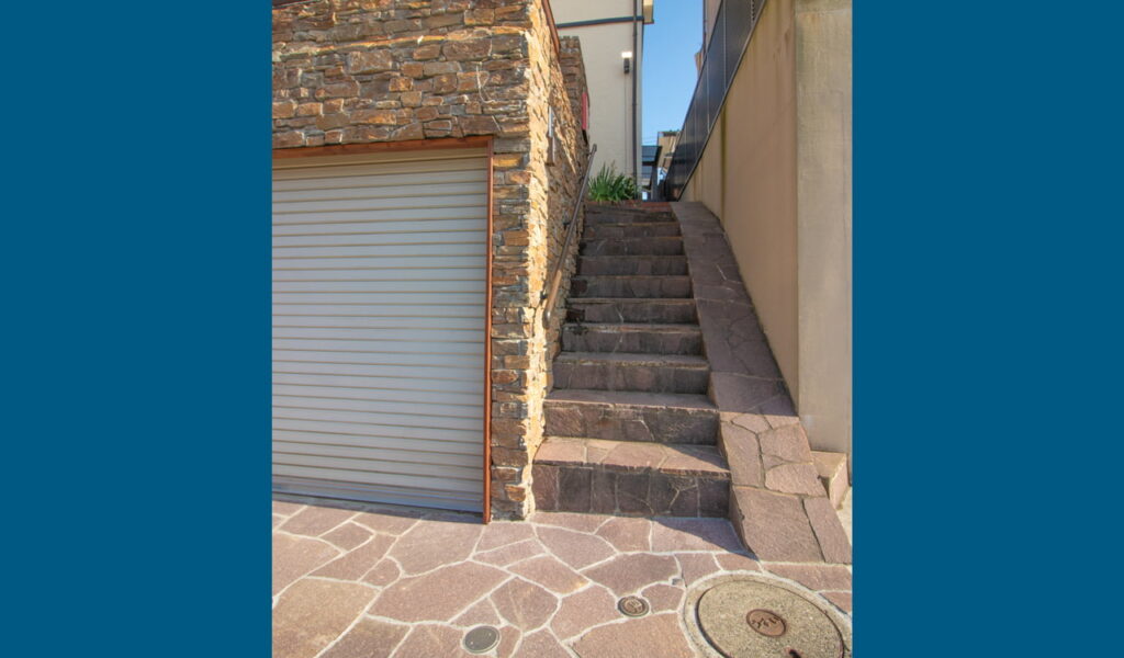 我々が特にこだわったのは、自然石の選択でした。最初にリフォームを行ったのは、アプローチ階段。コンクリートで無機質だった階段に、乱形の天然石貼りの装飾を施しました。しかし、ファサードで最も大きな割合を占める擁壁の印象が強く、せっかくならここも装飾したいと、改めてのご相談をいただきました。擁壁の上から茶系の自然石を貼り、存在感のあるエクステリアに生まれ変わりました。擁壁と階段、それぞれの素材がお互いの存在感に負けないながらも、ぶつかり合わない自然な印象を作り出しました。