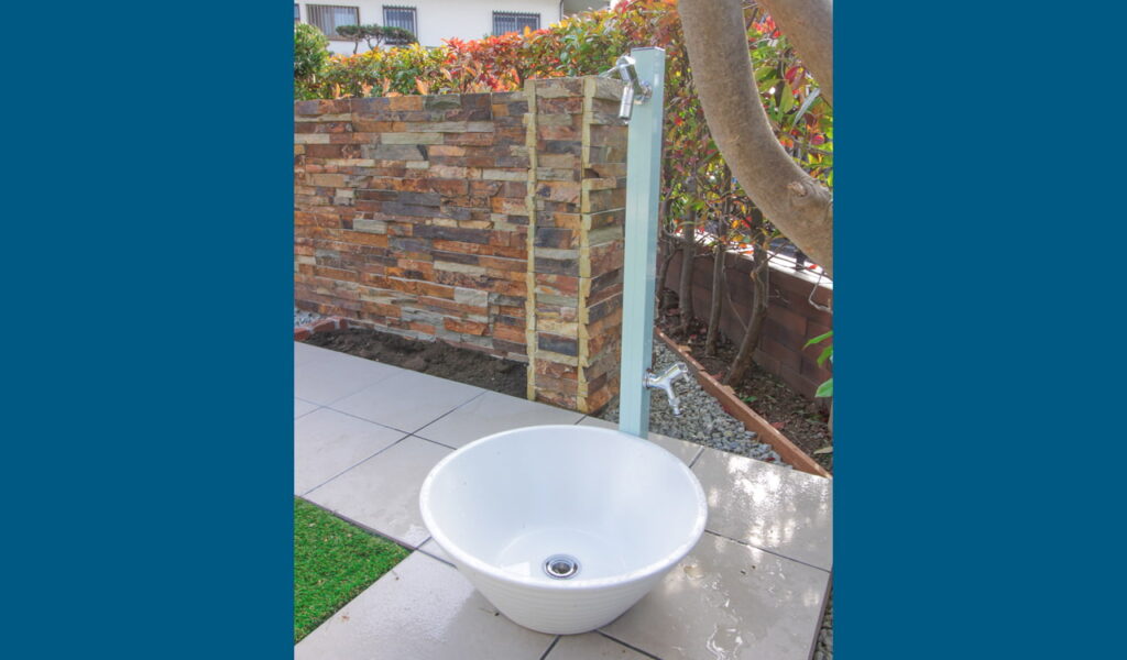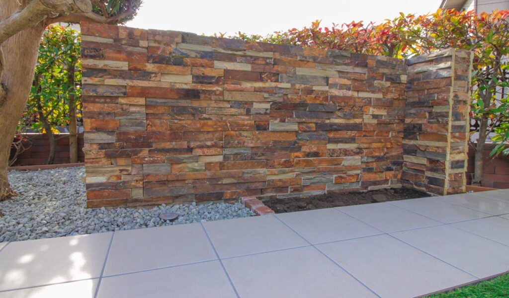 テラスと一体感のある立ち上げ花壇には、綺麗な樹形のドラセナを植え、自然な緑のアクセントを加えました。既存の植栽を移植しながら、テラスが緑に囲まれるよう植栽を計画しました。外からの目隠しと、お庭のデザインアクセントにもなっているタイル調石貼りの化粧袖壁、そしてパステルカラーの立水栓が、洗練された空間を更に引き立てています。
