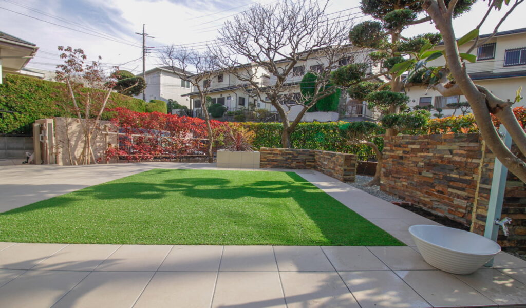 横浜市栄区の住宅街、その一軒の戸建て住宅にお住まいのお客様からご相談をいただきました。二年前にご新築された際、そのまま天然芝と植栽を残されていたお庭のリフォームをお考えでした。お客様は、お庭のお手入れの手間に限界を感じ、また、愛犬の遊び場としても利用したいとのご要望を、我々にご相談くださいました。