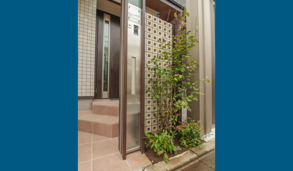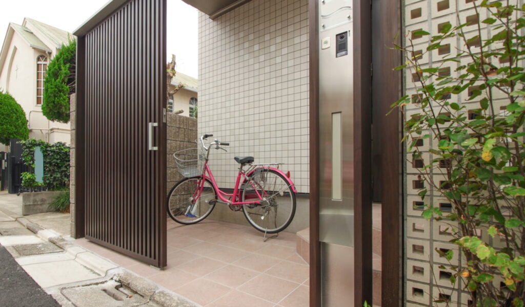 ご自宅玄関側のエントランスは、吊り引き戸仕様。スライド式の門扉は開口幅が広く、自転車も入れやすいとご好評です。門扉の横には、通気と採光を考慮して設置したLIXIL有孔ブロックウォールと、全体の雰囲気を和らげる植栽を配置しています。玄関の内側は、ほどよく光と風が通りながらも、、しっかりと目隠し、囲われた空間になっています。