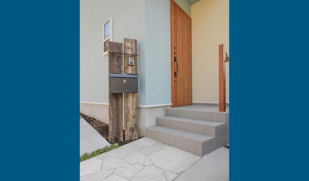 彼らの新築は水色の爽やかなカリフォルニアテイスト。そこに合うように、ナチュラルなプランを提案させていただきました。ファサードは枕木と天然石の乱貼りアプローチで、飾り気のないリゾートスタイルを目指しました。