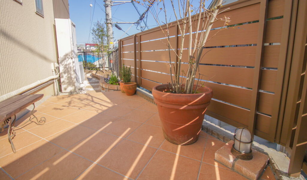 施工後のお庭は、テラコッタ色のタイルと木彫の目隠しフェンスがナチュラルな雰囲気を醸し出すテラス空間となりました。室内からスムーズに出入りできるように配慮したLIXILのガーデンルーム“COCOMA ココマ 腰壁タイプ”は、擁壁の上にあることで見晴らしが良く、開放感あふれる空間となりました。