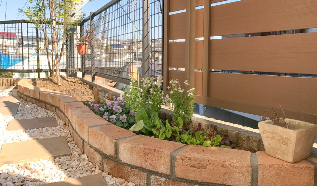 また、花壇などは部分的に残しながら、お庭全体がリフォーム前より広く使えるようになりました。アプローチに沿ってカーブしたレンガ積みの花壇は、温かみのあるナチュラルな雰囲気です。これらの工夫によりお客様のお庭は、機能性と美しさを兼ね備えた素敵なガーデンへと生まれ変わりました。