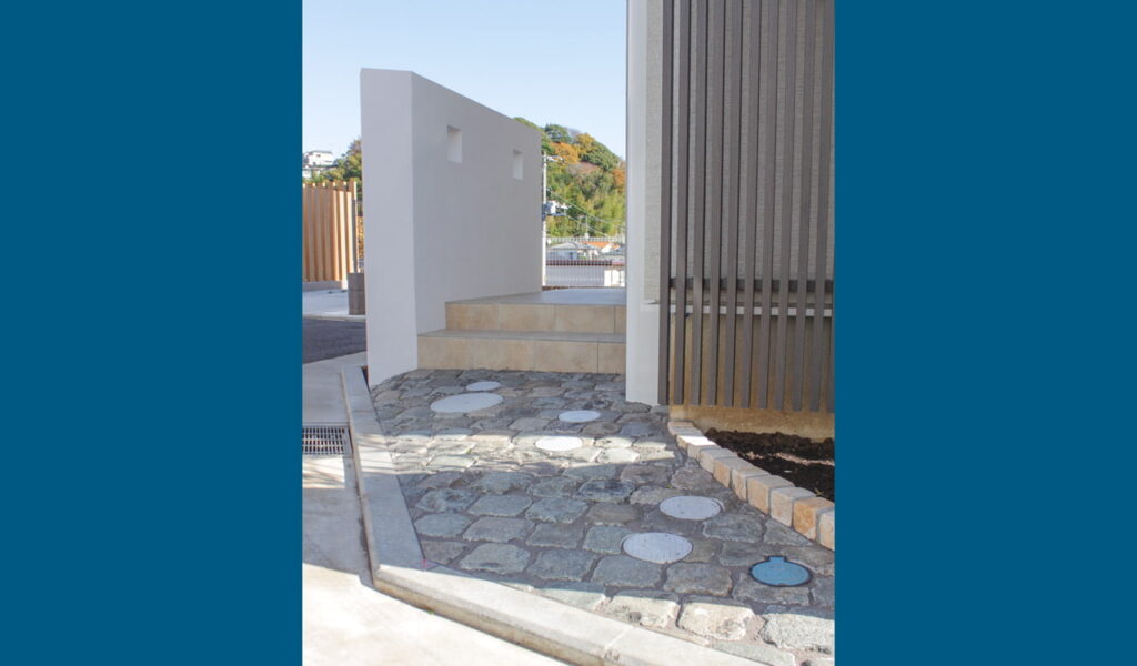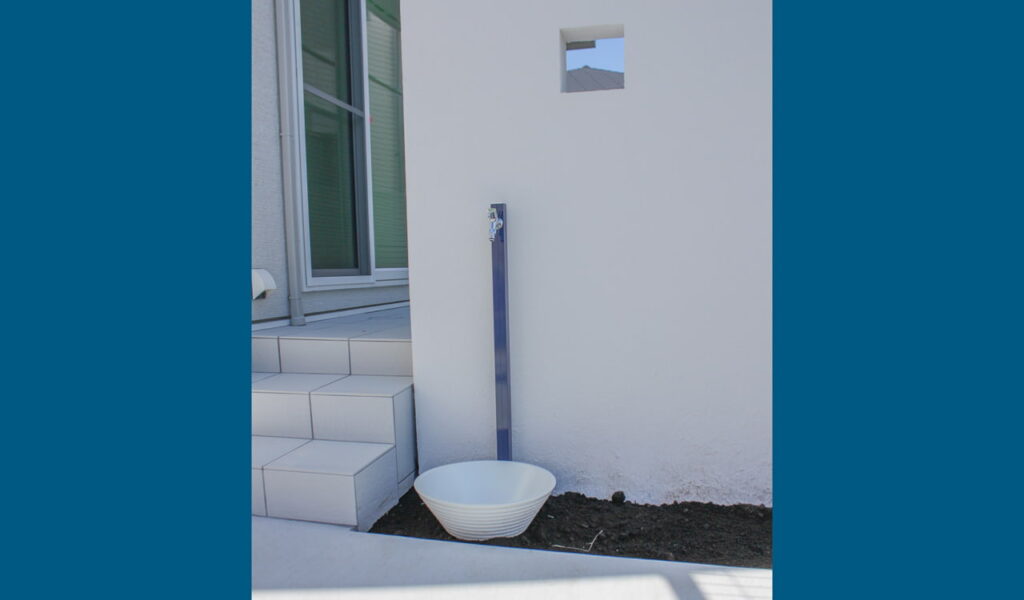 来客用の駐車スペースがファサードとなるため、曲線のスリットが特徴的で、インパクトのあるデザインに仕上げました。全体を建物と同じホワイトで統一したプランニングです。白いジョリパット塗りの門袖に白いポストの組み合わせ、ジョリパット塗りの塀に紺の立水栓、そして白のタイルテラスと白い目隠しフェンスで清潔感のある組み合わせは、明るく開放的な印象を与えています。