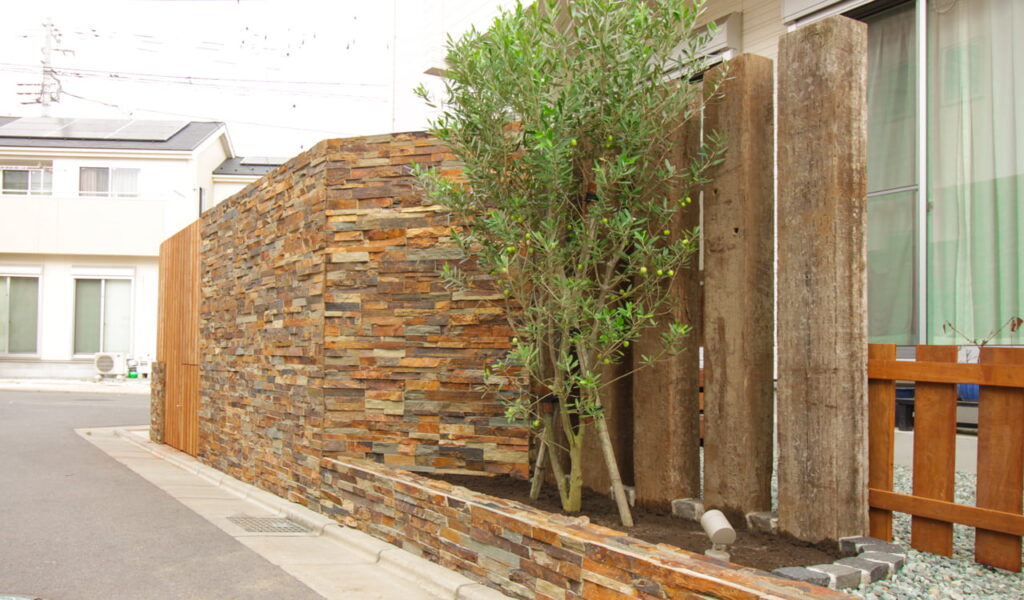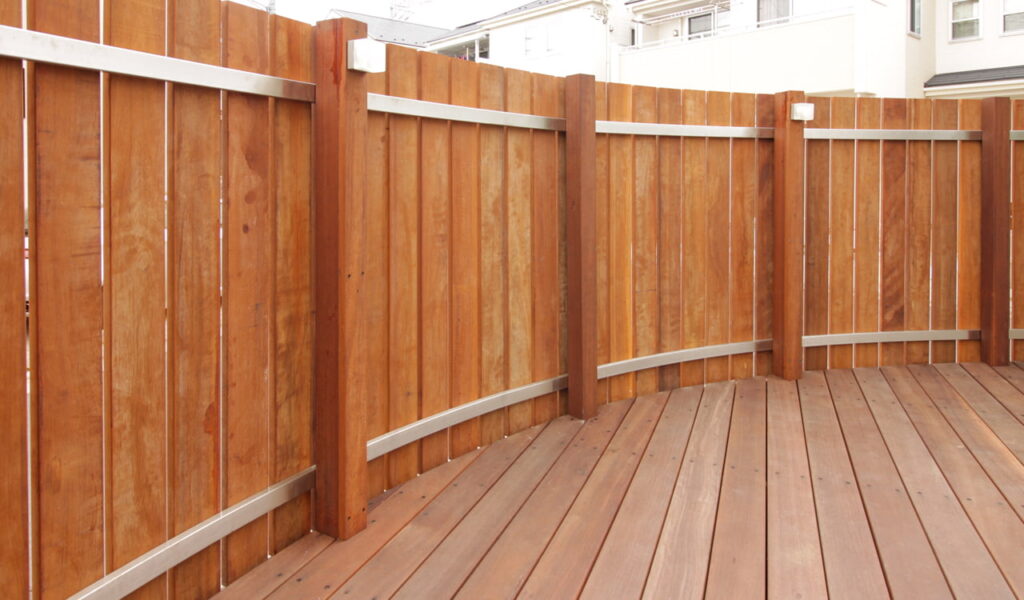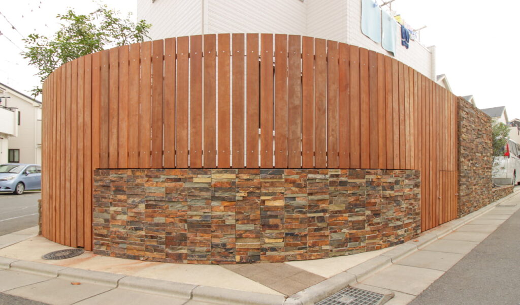 そのウッドデッキの周囲には、自然石貼りの塀とウリンで造作した縦格子のフェンスを配置。ここには私たちのこだわりが詰まっています。曲線に造作した縦格子フェンスは、風を適度に通し、視線を遮りながらも開放感を損なわないよう工夫が施されています。また、オリジナルのスチール製胴縁は、強度を確保しつつ、ウリンの風合いを引き立てる役割を果たしています。