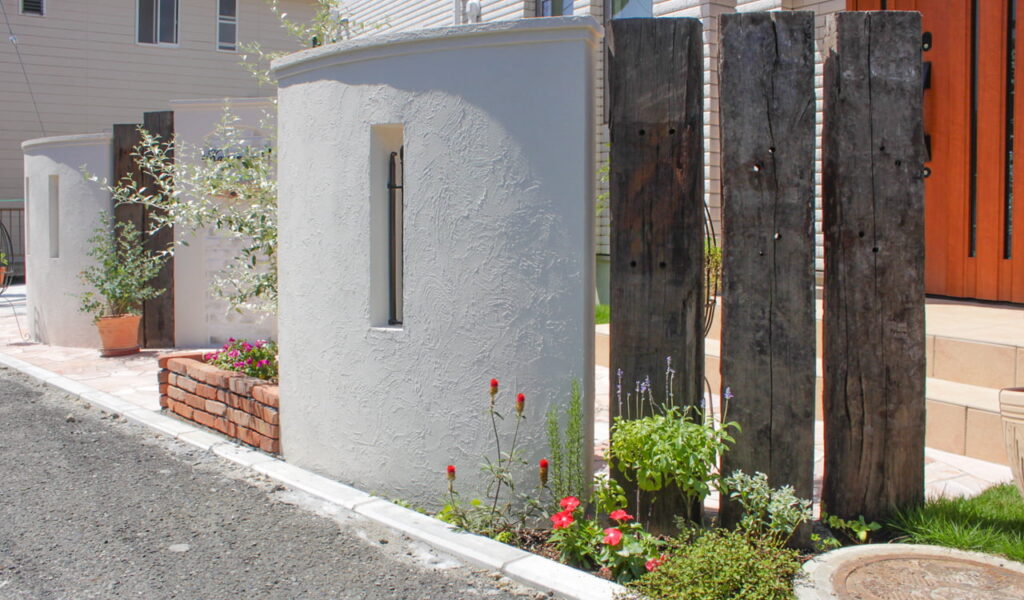 まず目を引くのは、曲線がエレガントな白いレンガの門袖と枕木の組み合わせ。これにより、ヨーロピアン調のファサードが実現しました。素材を変えつつ、シンプルになりすぎないデザインを心掛け、飽きのこない外観を作り上げました。